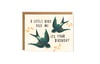 "A little bird told me it's your birthday" with deep teal barn swallow illustrations.