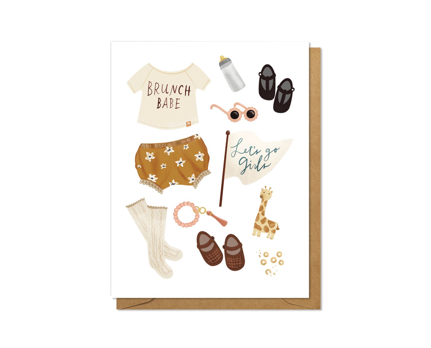 New for Spring! The boho-style "Brunch Babe" card will make a memorable impression at your next baby shower and help moms-to-be get more excited about having a little girl with all the adorable illustrated baby clothes and accessories.