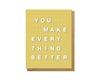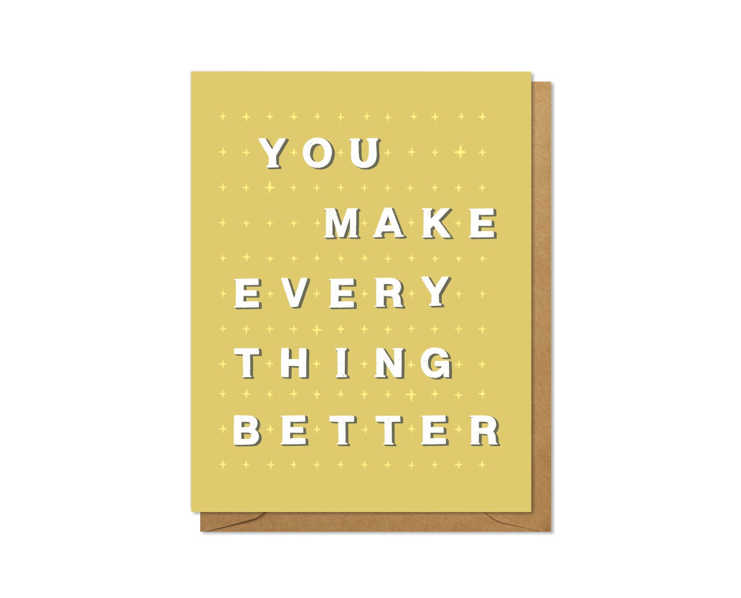 New for Spring! The hand-lettered "You Make Everything Better" blank inside card has a fresh lemon-lime color and will brighten anyone's day. Use as a thank you, friendship sentiment, thinking of you, or birthday card.
