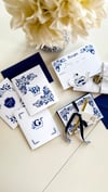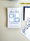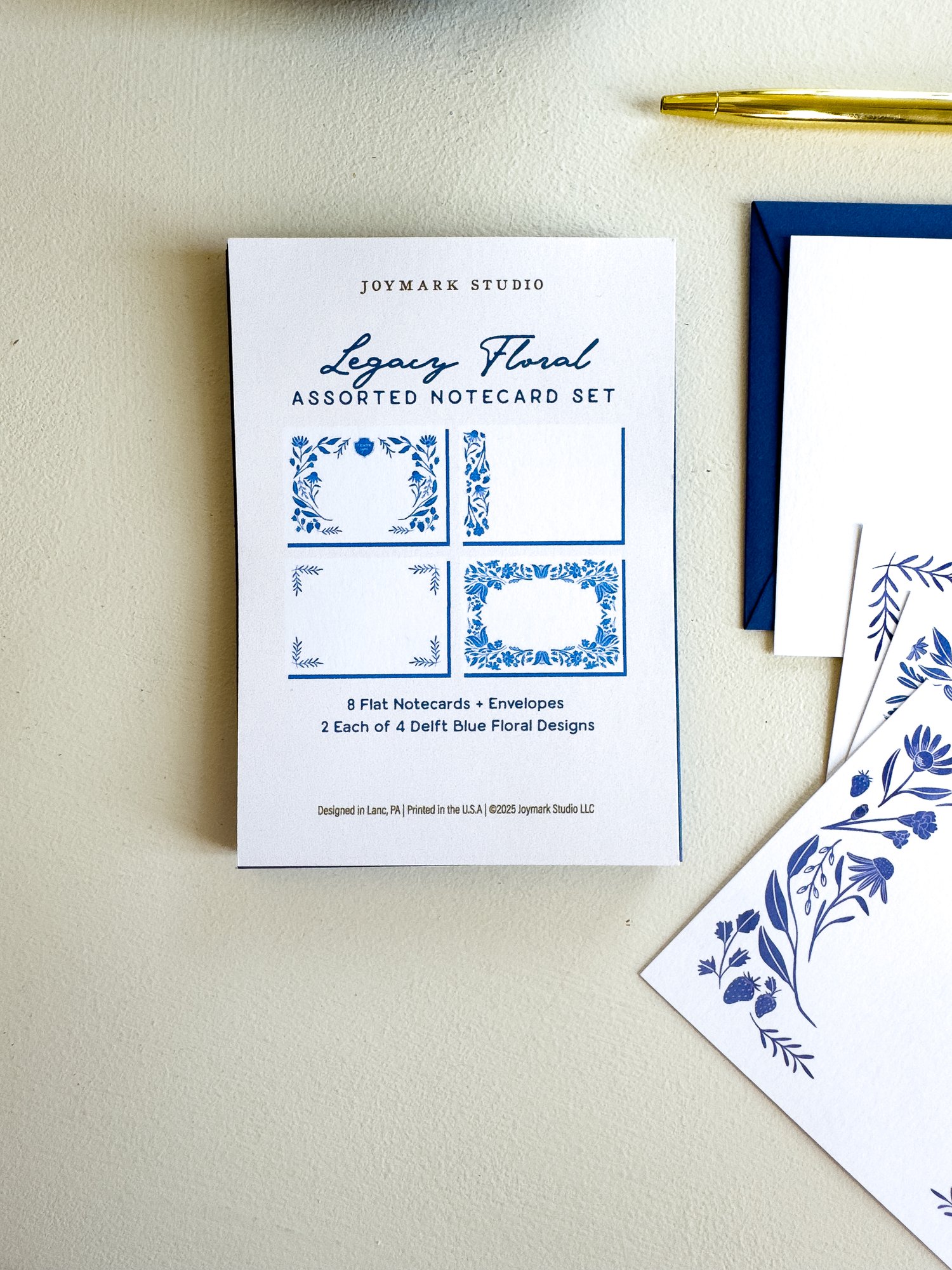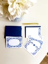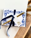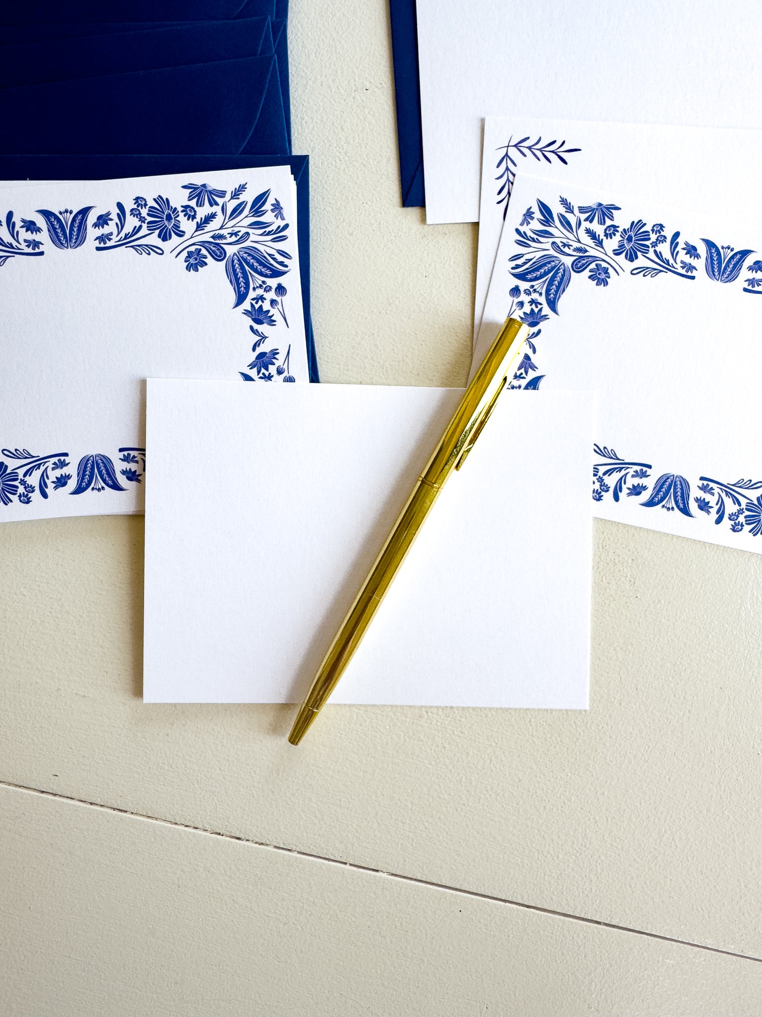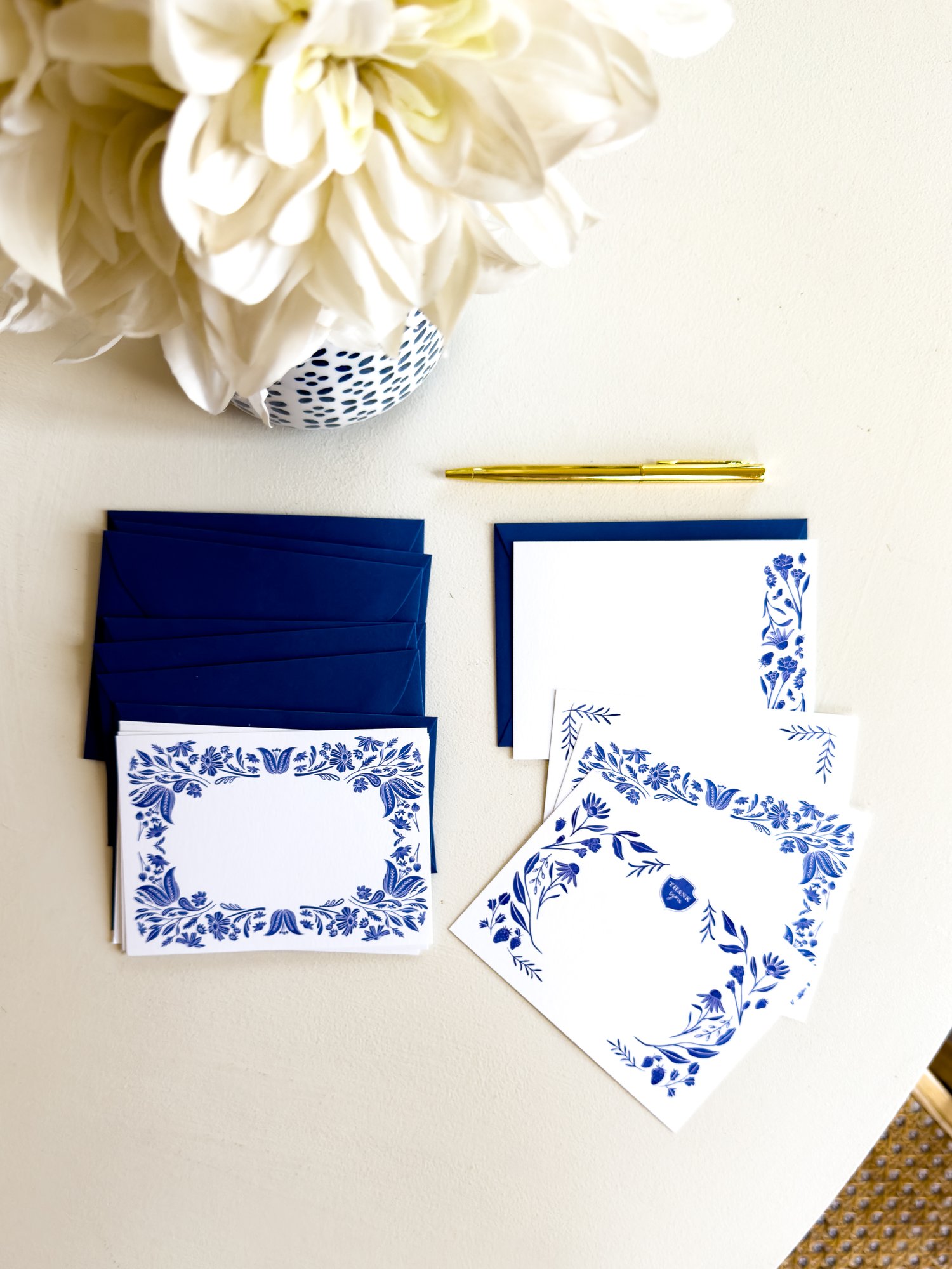 The Legacy Notecard Set contains 8 notecards (4 styles, 2 of each) with coordinating sapphire-blue envelopes. These versatile notecards feature classic blue and white Delft-inspired watercolor florals. They are perfect for your bridal events, rehearsal dinners, wedding day, or everyday luxury. Each set is packaged with velvet ribbon, a gold-foiled tag, and a gold ballpoint pen.