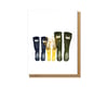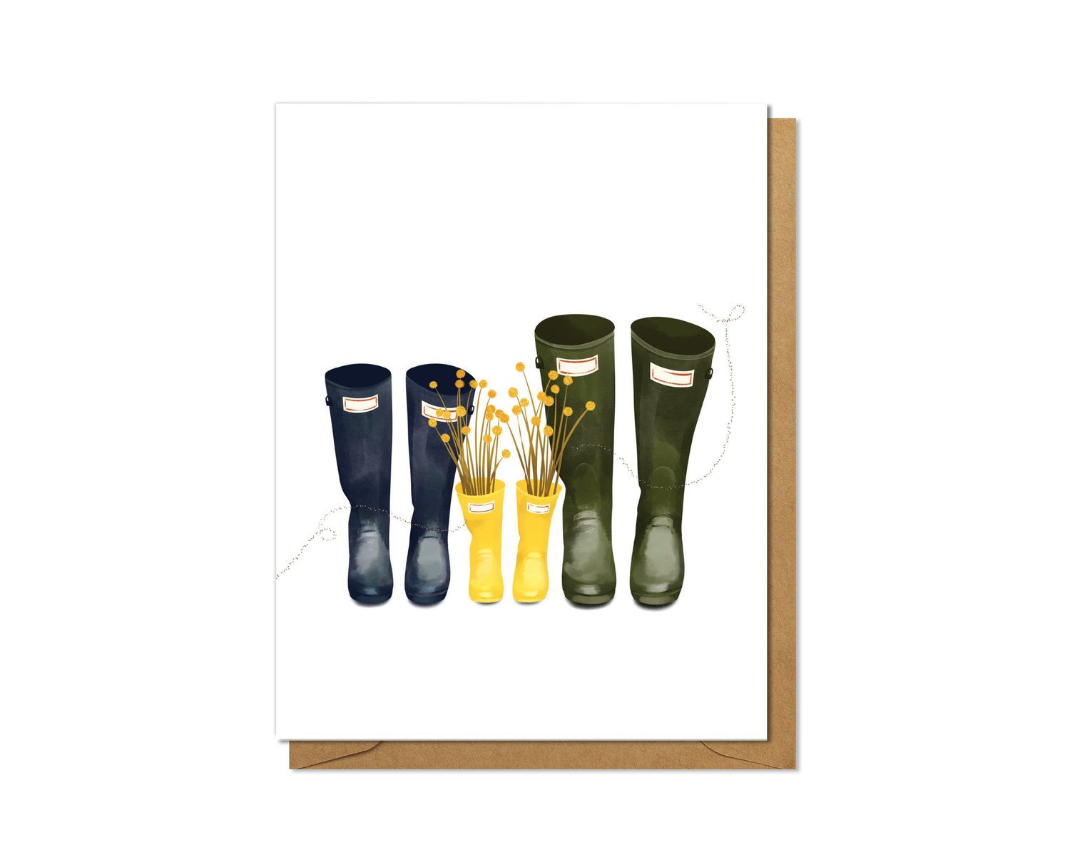 Vibrant yellow florals burst from a pair of bright yellow baby rain boots (or wellies) situated between adult-size rain boots in navy blue and hunter green. A gorgeous card for a baby shower or multiple other occasions and everyday sentiments.